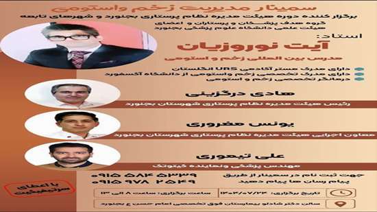 سمینار مدیریت زخم واستومی ویژه گروه هدف پزشکان، پرستاران و اعضای هیئت علمی دانشگاه علوم پزشکی خراسان شمالی برگزار می شود.