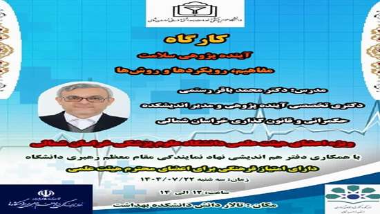 کارگاه آینده پژوهی سلامت مفاهیم، رویکردها، و روش ها با تدریس دکتر محمد باقر رستمی دکتری تخصصی آینده پژوهی و مدیر اندیشکده حکمرانی و قانون گذاری خراسان شمالی برگزار می شود.